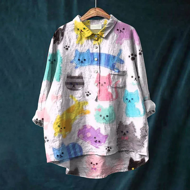 Dashingsoul Women's Colorful Cute Kitten Art Print Casual Lapel Blouse