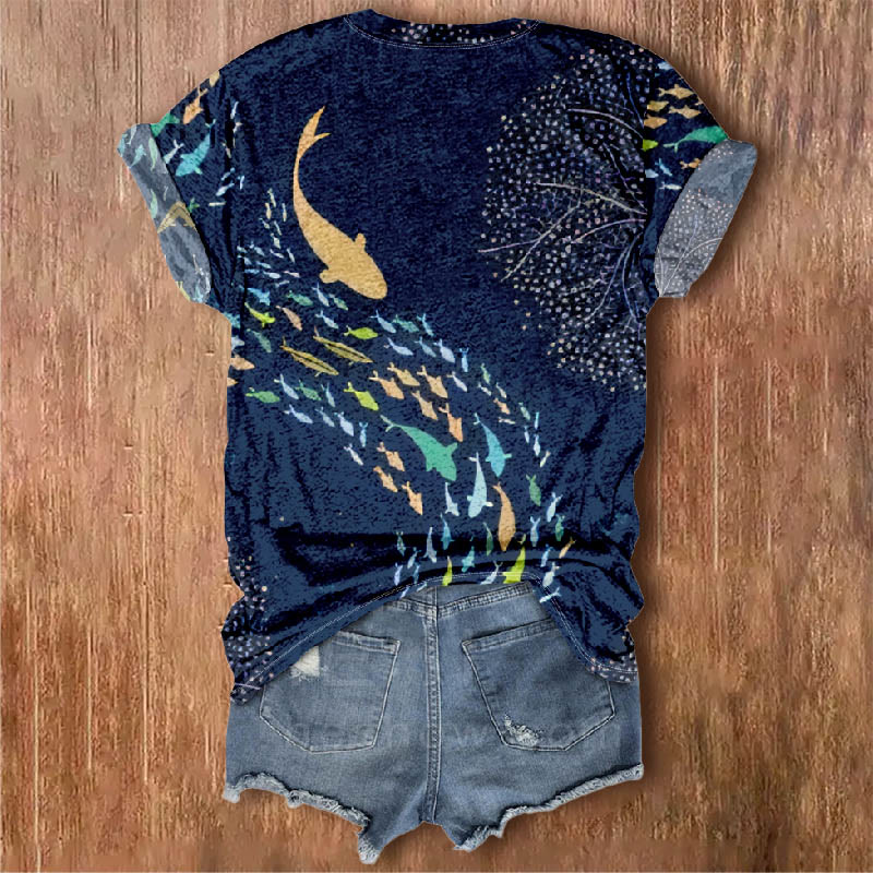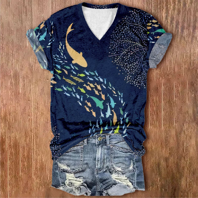 Dashingsoul Women's Colorful Lovely Whales Print V-neck Short-sleeved T-shirt
