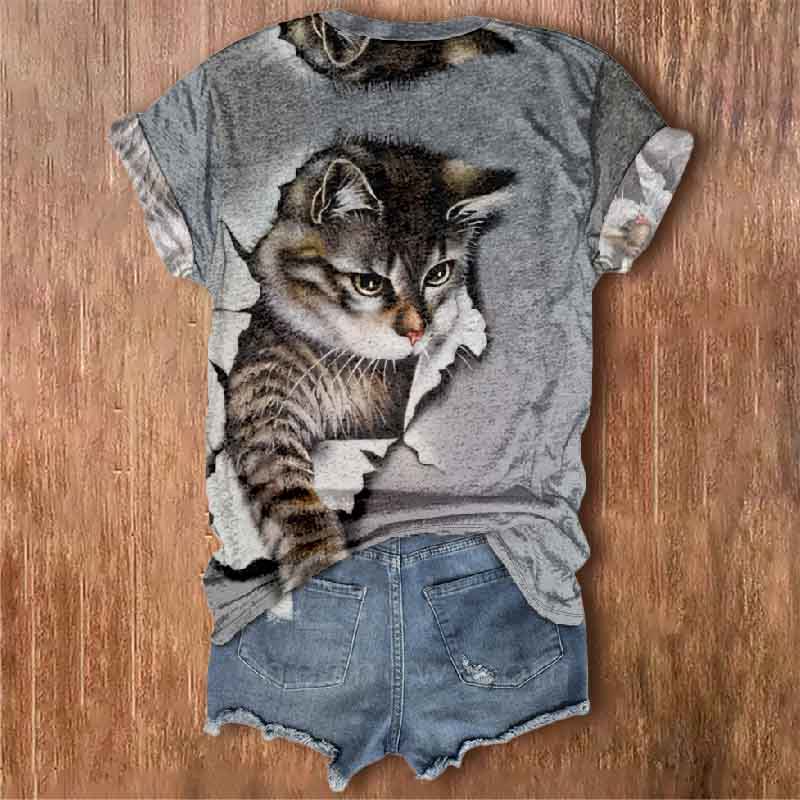 Dashingsoul Women's Creative Cat Tearing Box Get Out Art Print V-neck T-shirt
