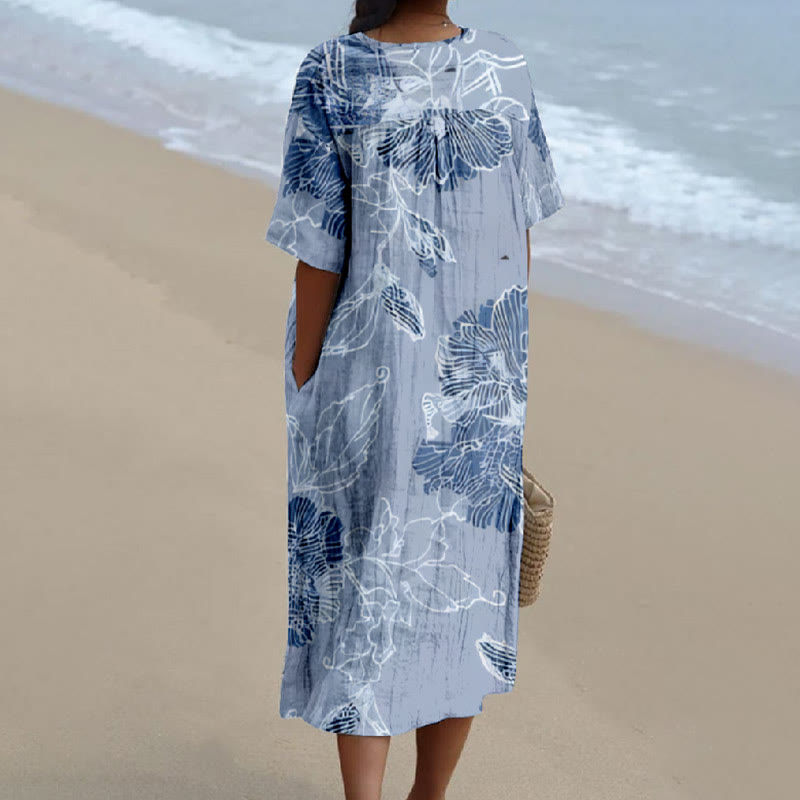 Dashingsoul Women's Fantasy Blue Watercolor Floral Art Print V-neck Short Sleeved Casual Midi Dress