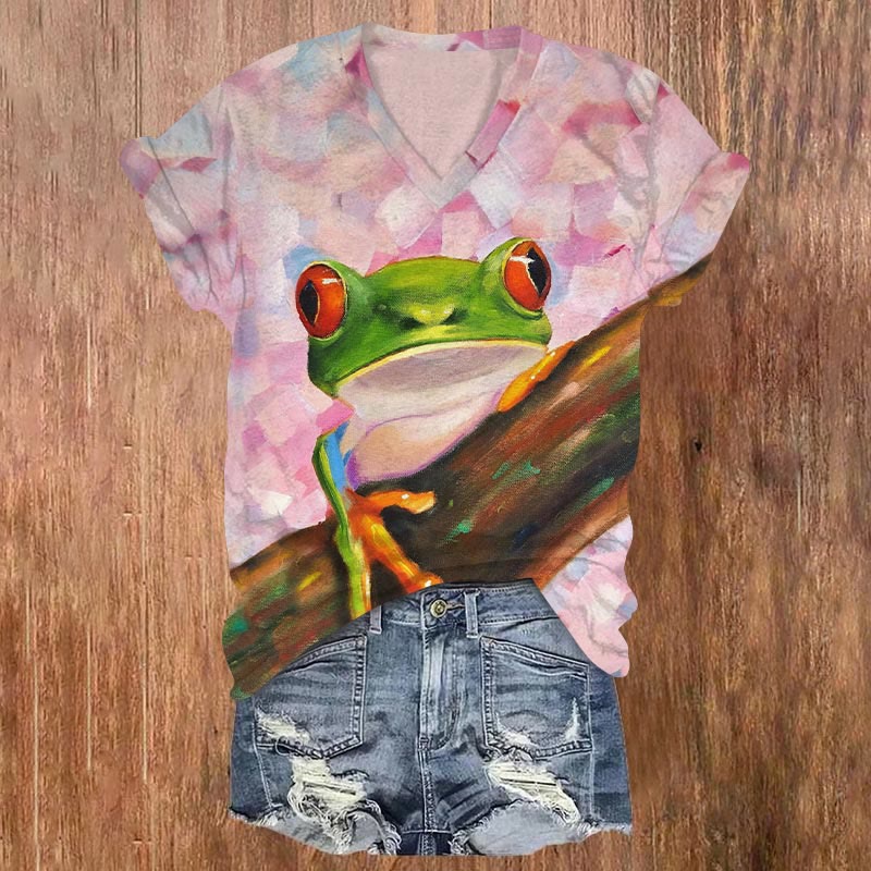 Dashingsoul Women's Frog Oil Painting Art Print V-neck T-shirt