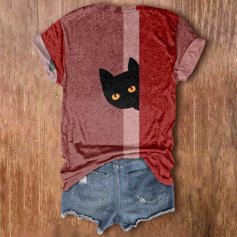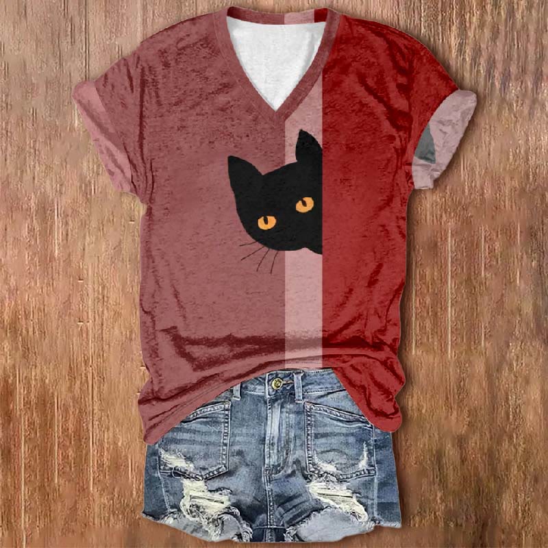 Dashingsoul Women's Funny Cat Poking Its Head Print V-neck Short-sleeved T-shirt