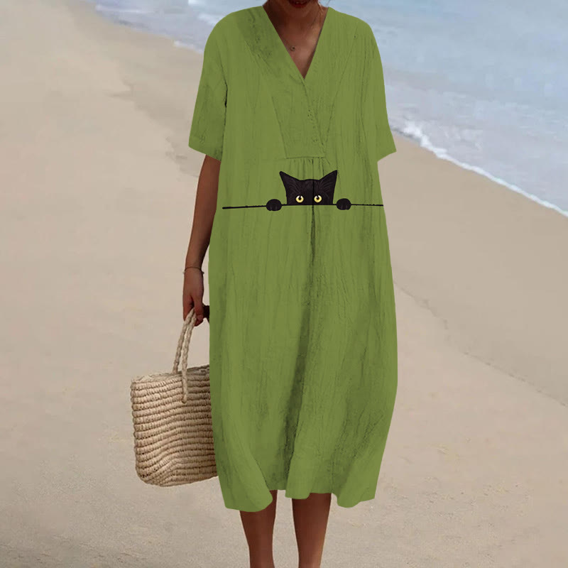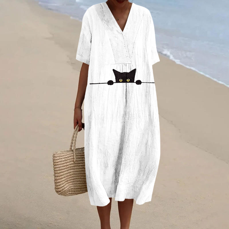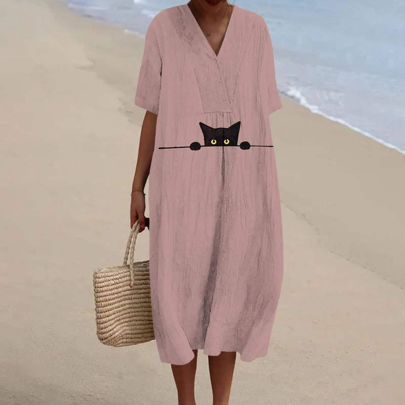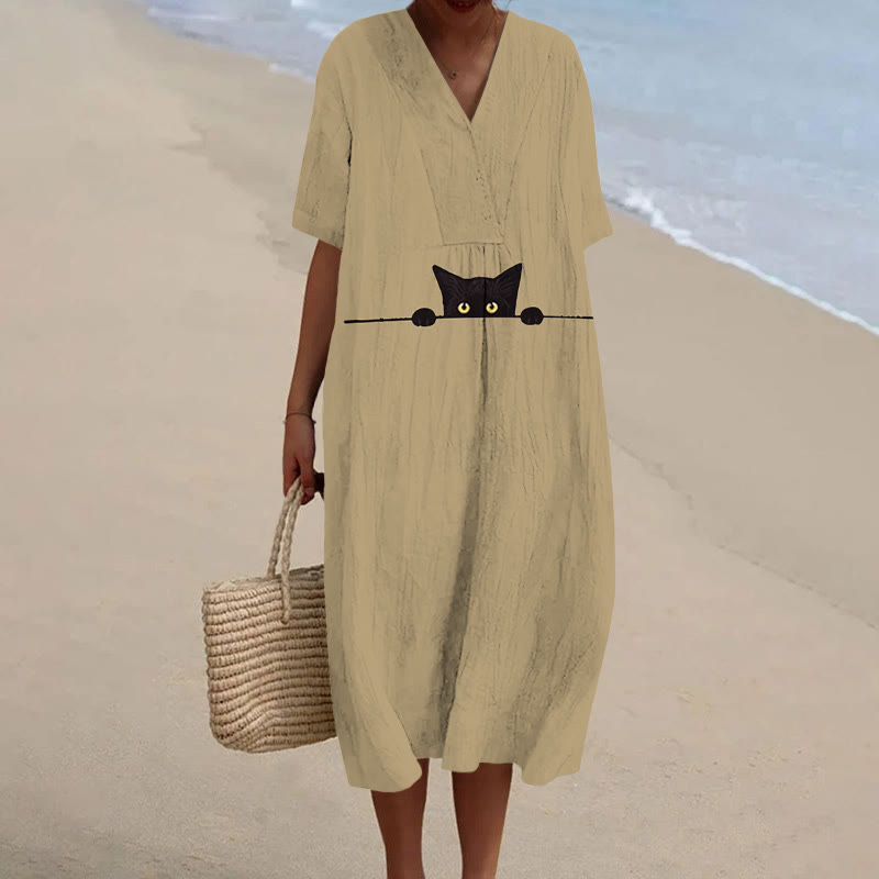 Dashingsoul Women's Funny Peeping Little Cat Art Print Short-sleeved Midi Dress