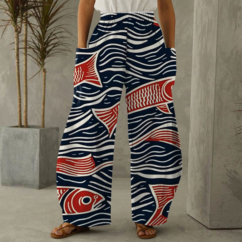 Dashingsoul Women's Funny Wavy Abstract Fish Art Print Casual Pants