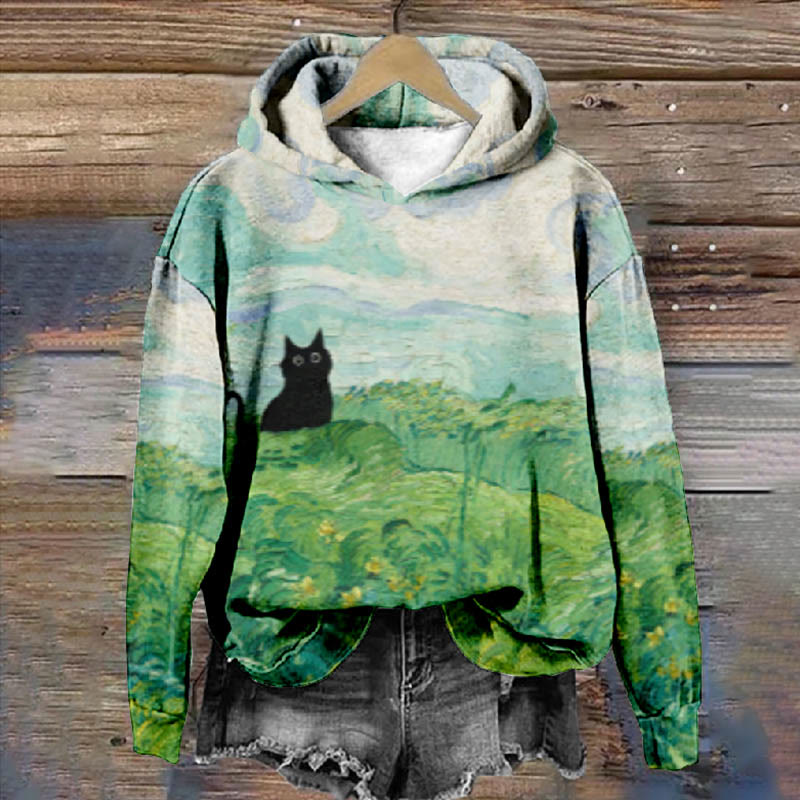 Dashingsoul Women's Grassland Cute Black Cat Print Casual Long Sleeve Hoodie