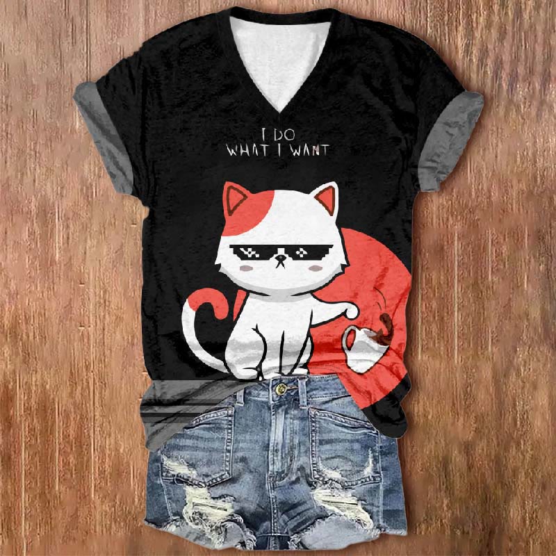 Dashingsoul Women's I Do What I Want Cool Coffee Cat Print V-neck Short-sleeved T-shirt