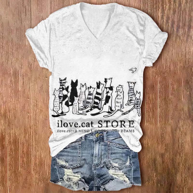 Dashingsoul Women's I Love Cat Store Pattern Print V-neck Short-sleeved T-shirt