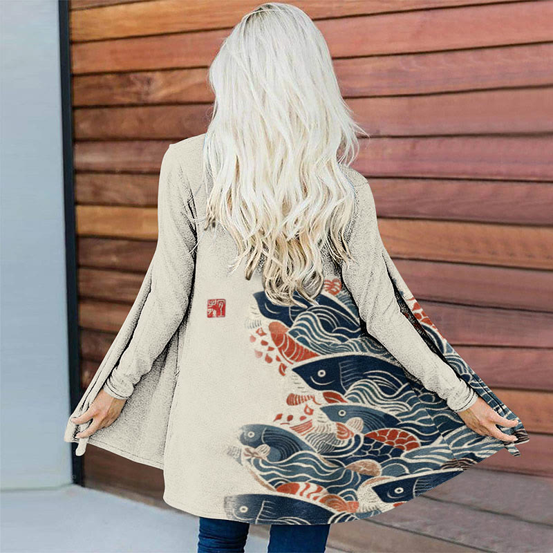 Dashingsoul Women's Japanese Art Carp Print Long Sleeve Cardigan