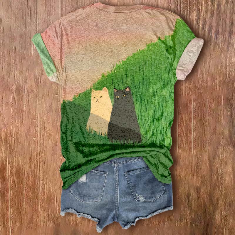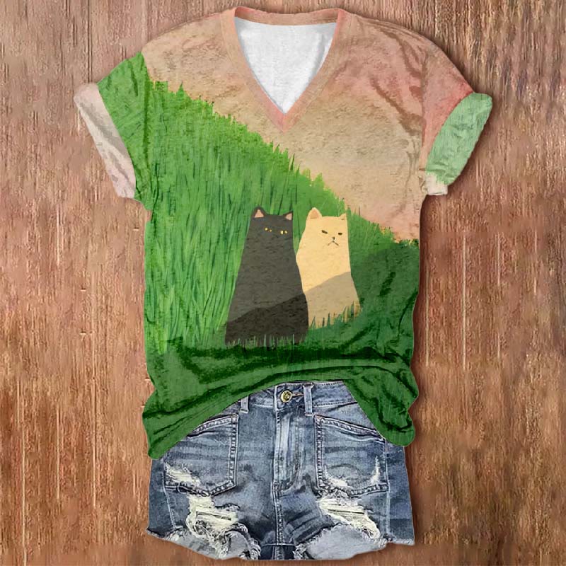 Dashingsoul Women's Japanese Grass Cartoon Cat Print V-neck Short-sleeved T-shirt