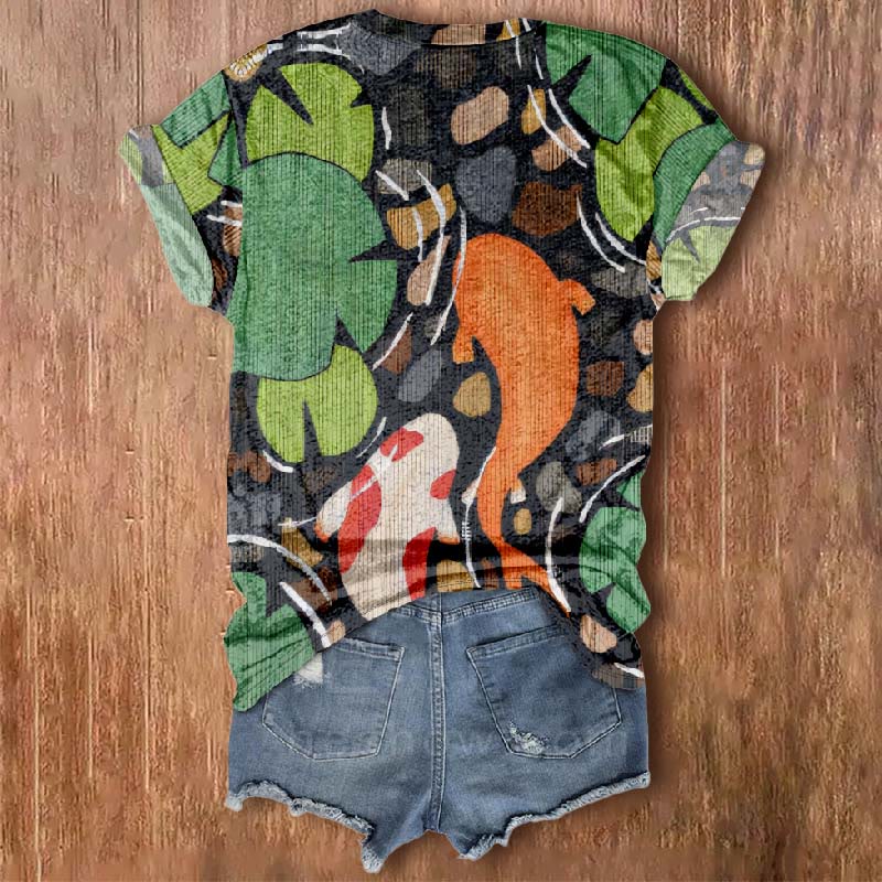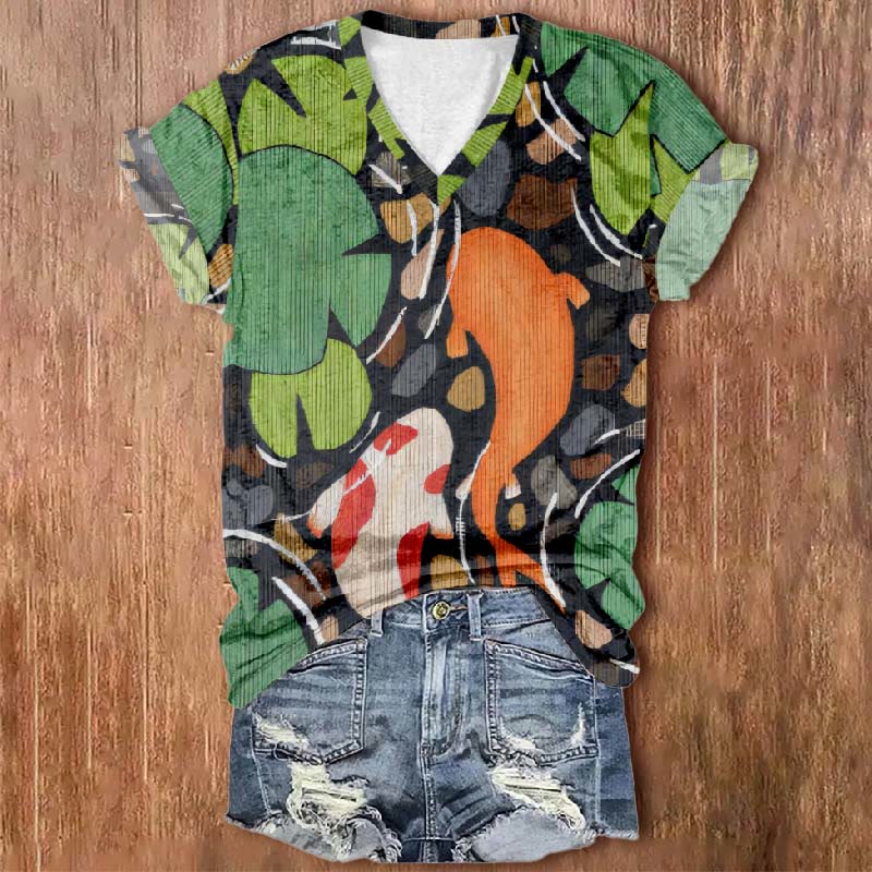 Dashingsoul Women's Japanese Lotus Leaf Koi Fish Print V-neck Short-sleeved T-shirt