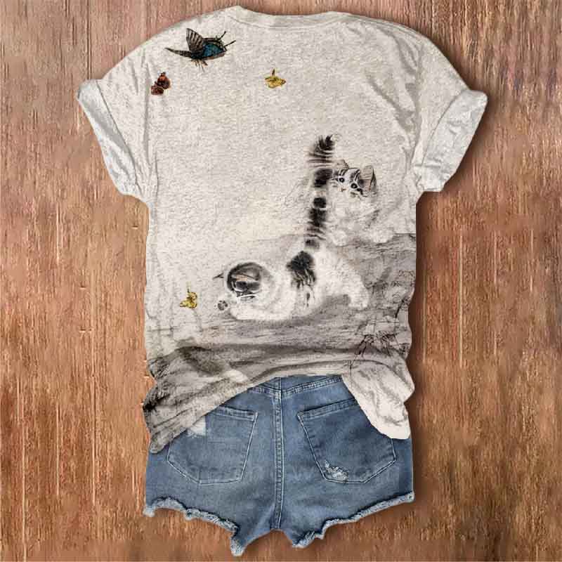 Dashingsoul Women's Japanese Style Cute Cat Chasing Butterfly Print V-neck T-shirt