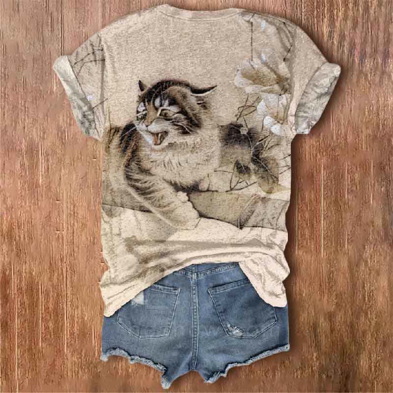 Dashingsoul Women's Japanese Style Meowing Cat Floral Art Print V-neck T-shirt