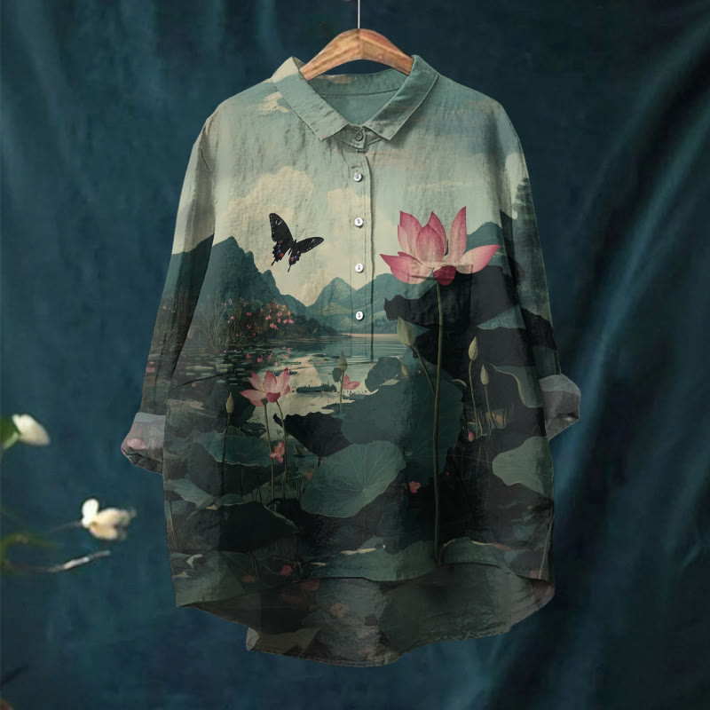 Women's Lovely Butterfly With Lotus Pond Art Print Casual Lapel Blouse