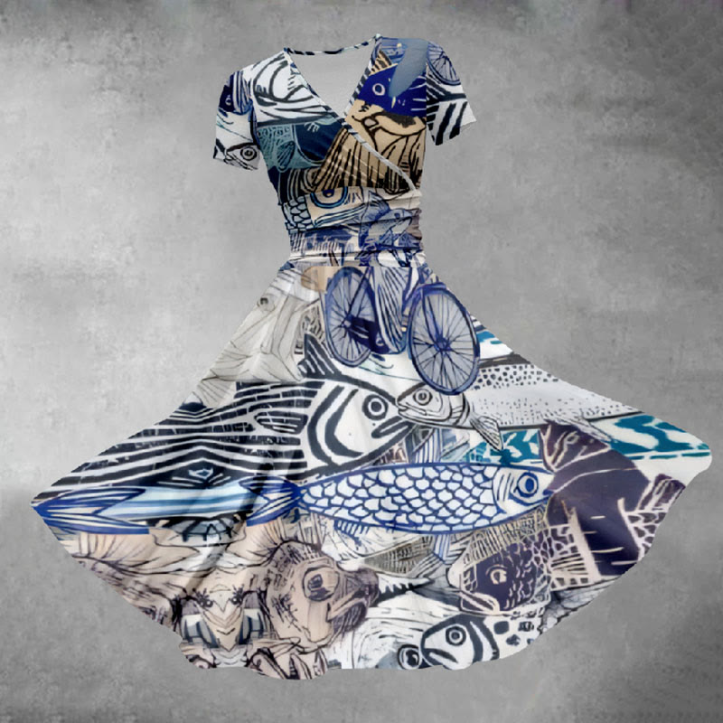 Dashingsoul Women's Multicolor Funny Fish Riding Bike Print Midi Dress