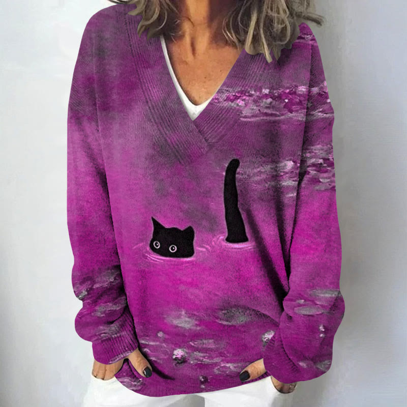 Women's Oil Painting Cat Print Causal V-neck Pullover Sweater
