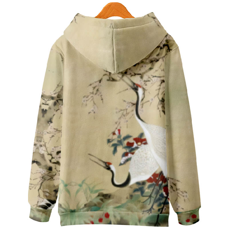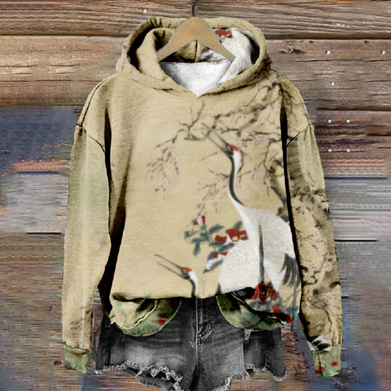 Dashingsoul Women's Oil Painting Chirping Crane Floral Print Casual Long Sleeve Hoodie