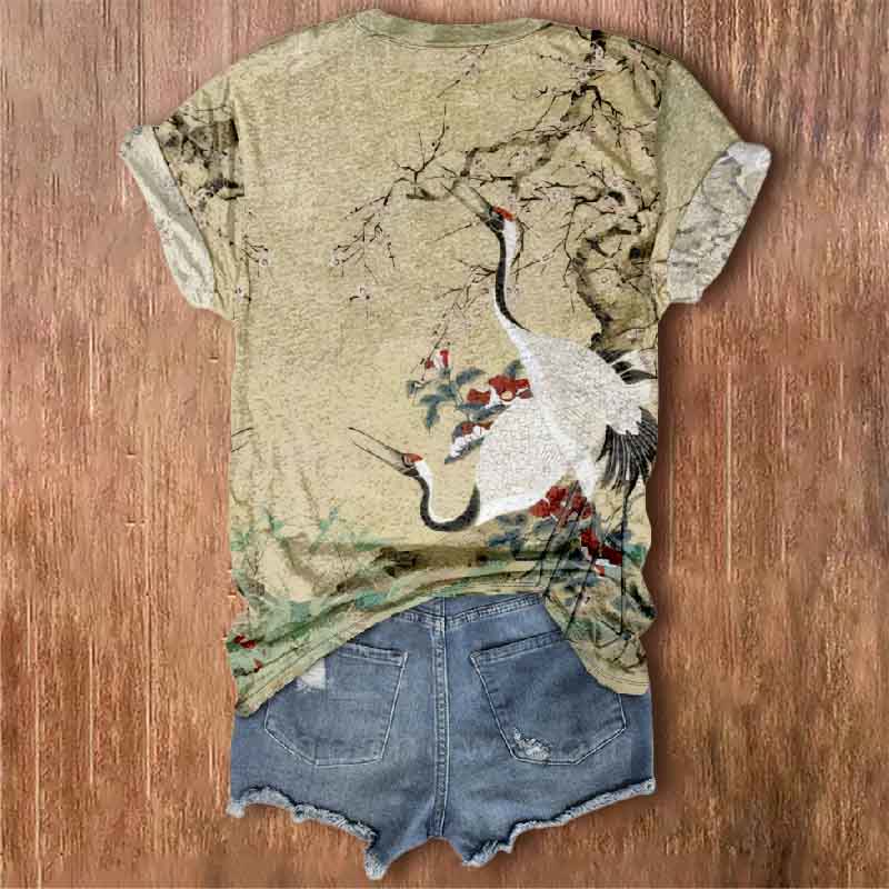 Dashingsoul Women's Oil Painting Chirping Crane Floral Print V-neck T-shirt