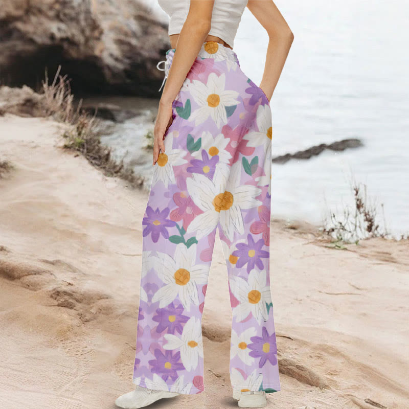 Dashingsoul Women's Oil Painting Colorful Chrysanthemum Flower Art Drawstring Casual Pants