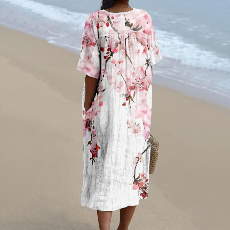 Dashingsoul Women's Oil Painting Lovely Japanese Sakura Art Print V-neck Short Sleeved Casual Midi Dress