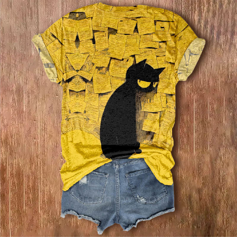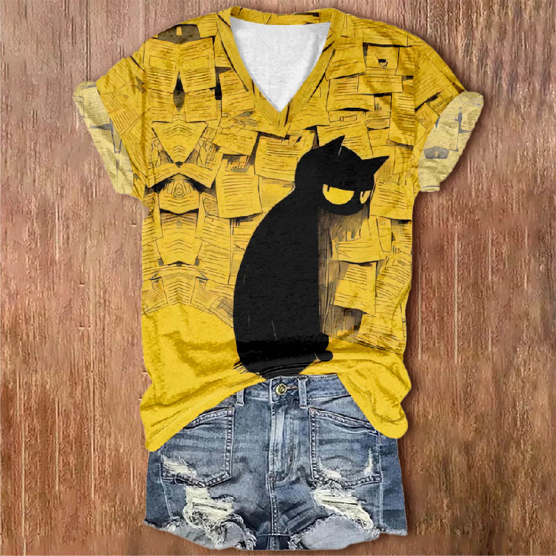 Dashingsoul Women's Sticky Note Plaintive Black Cat Print V-neck Short-sleeved T-shirt
