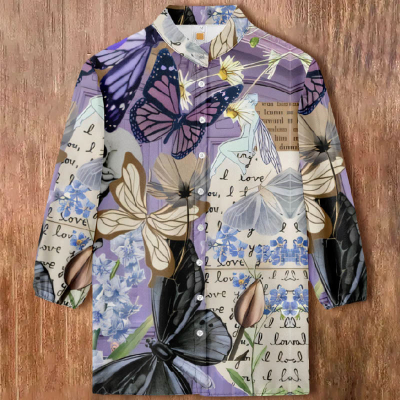 Dashingsoul Women's Vivid Butterfly Daisy Floral Art Print Casual 3/4 Sleeve Blouse