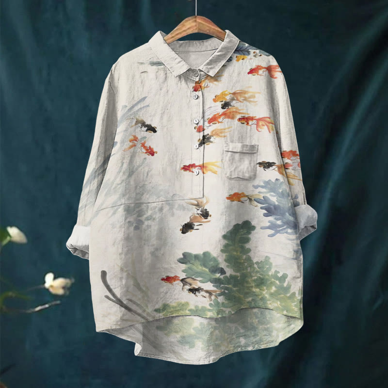 Dashingsoul Women's Watercolor Goldfish Art Print Casual Lapel Blouse