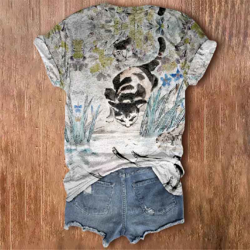 Dashingsoul Women's Watercolor Painting Abstract Cat Staring Art Print V-neck T-shirt
