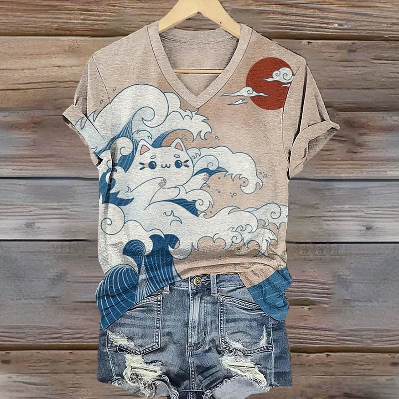 Dashingsoul Women's Wave Cats Red Sun Print V-neck T-shirt
