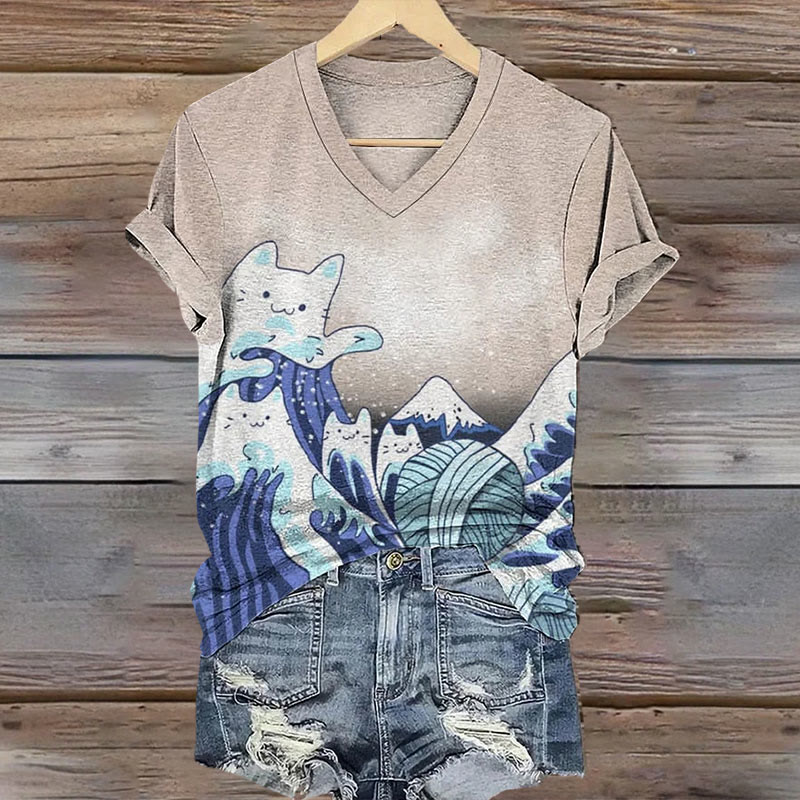 Dashingsoul Women's White Cats Wave Print V-neck T-shirt