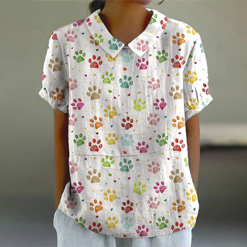 Dashingsoul Women's Lovely Colorful Dog Footprint Art Print Casual Lapel Loose Blouse