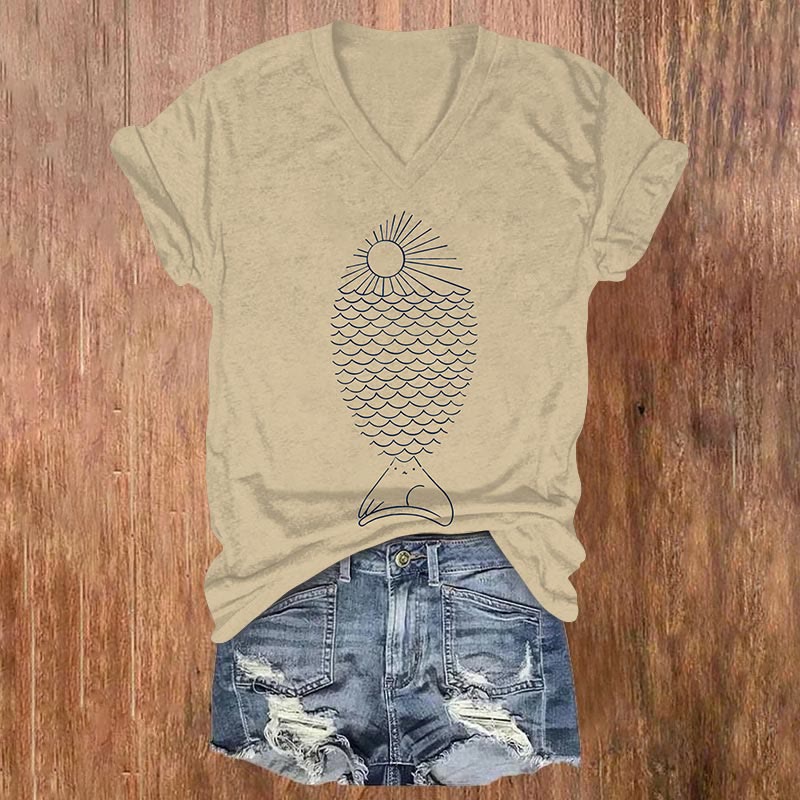 Dashingsoul Creative Design Simple Cat Fish Art Print Casual V-neck Short-sleeved T-shirt