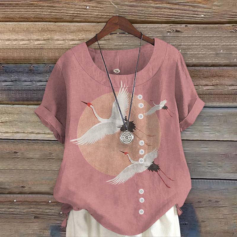 Dashingsoul Flying Cranes Japanese Art Print Short Sleeve Blouse