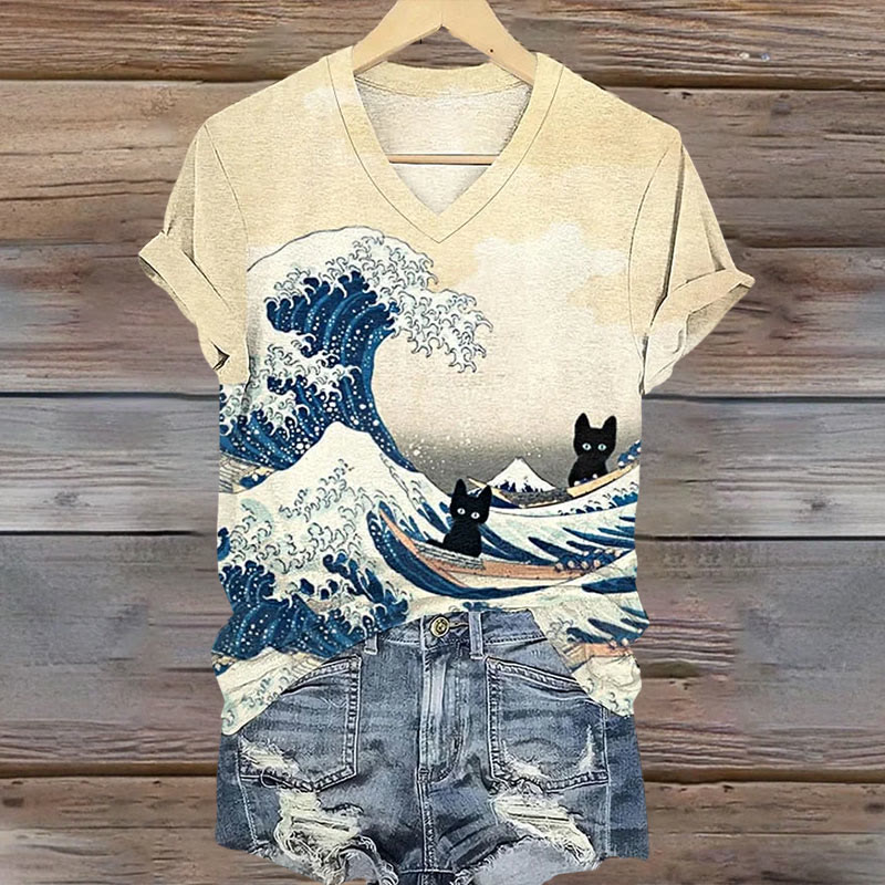 Dashingsoul Women's Wave Black Cats Print V-neck T-shirt