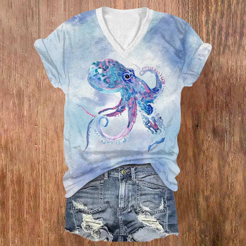 Ocean Octopus Print Short-Sleeve V-Neck T-Shirt