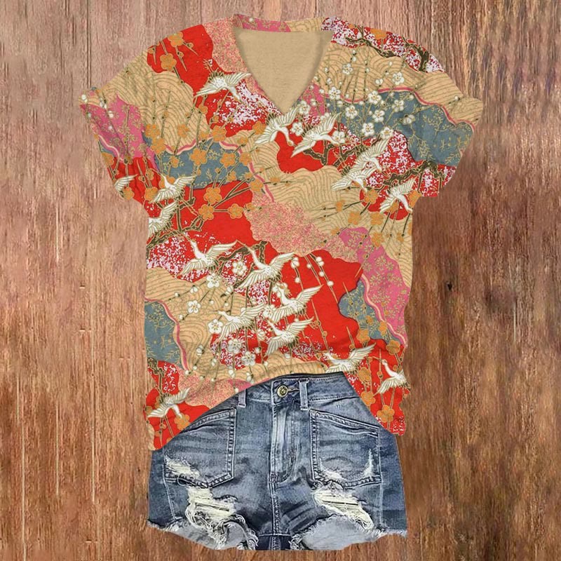 Dashingsoul Vintage Japanese Crane And Plum Blossom Print V-neck Short-sleeved T-shirt
