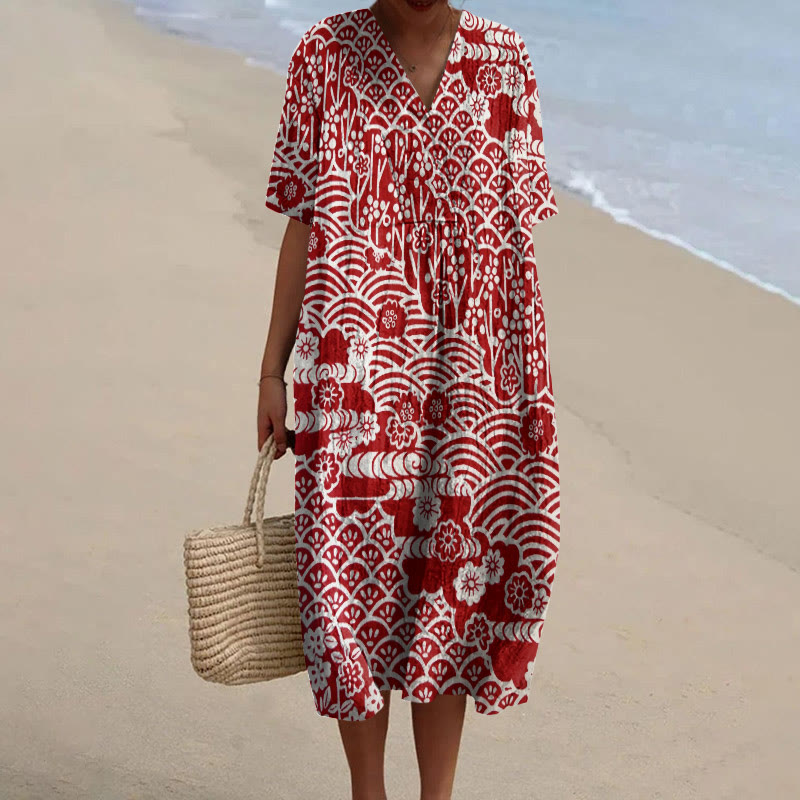 Dashingsoul Japanese Floral Art Print V-neck Short Sleeved Casual Midi Dress