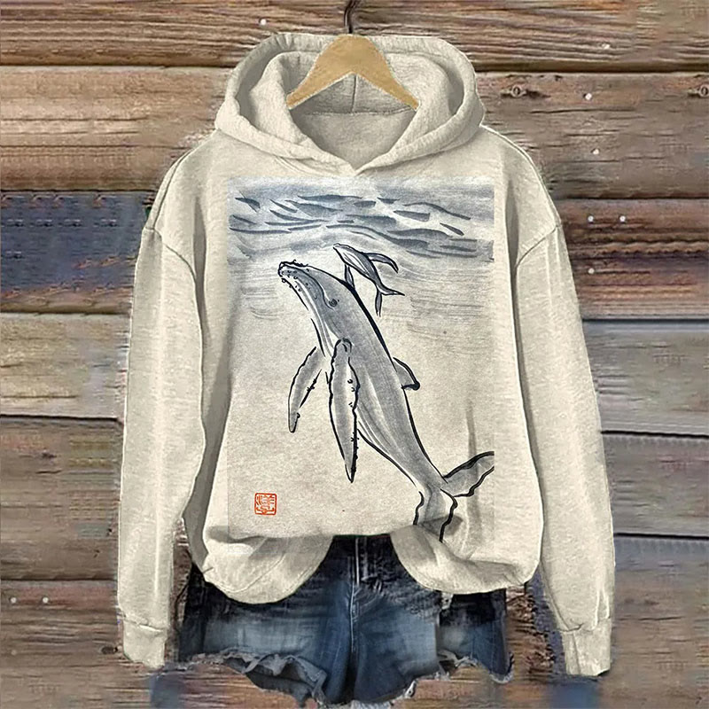 Dashingsoul Japanese Art Ink Painting Whale Print Casual Long Sleeve Hoodie