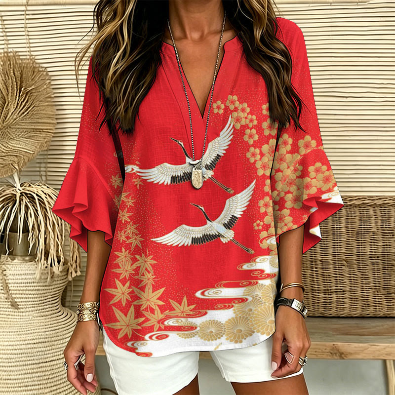 Japanese Style Floral Crane Print V-neck Half Sleeve Blouse