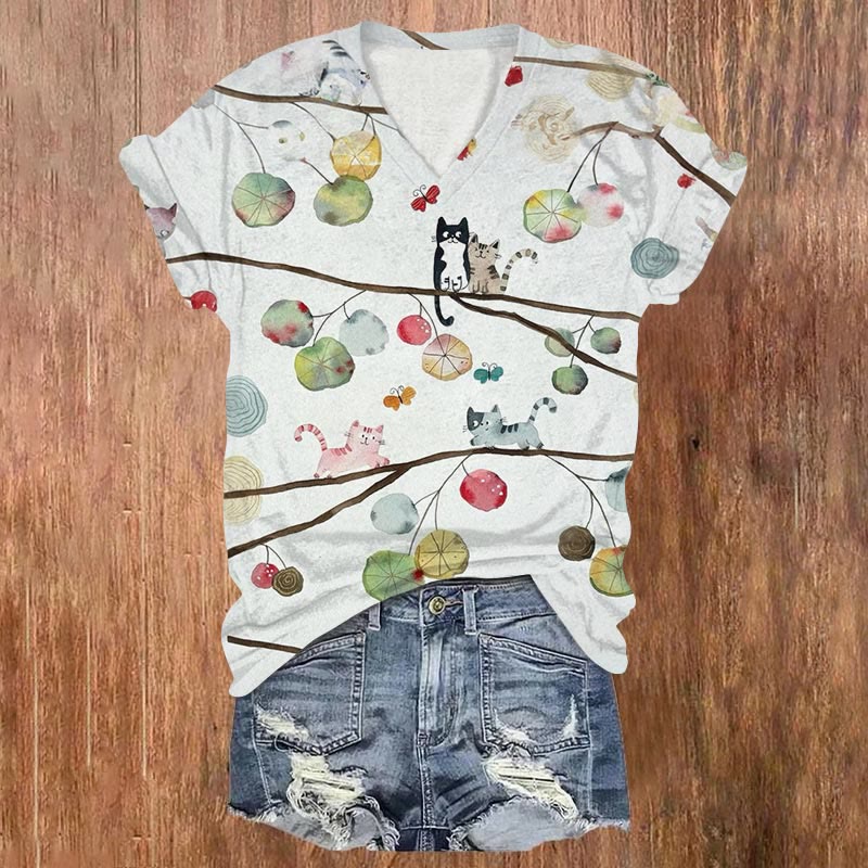 Cute Cat Print Short Sleeved V-Neck T-Shirt