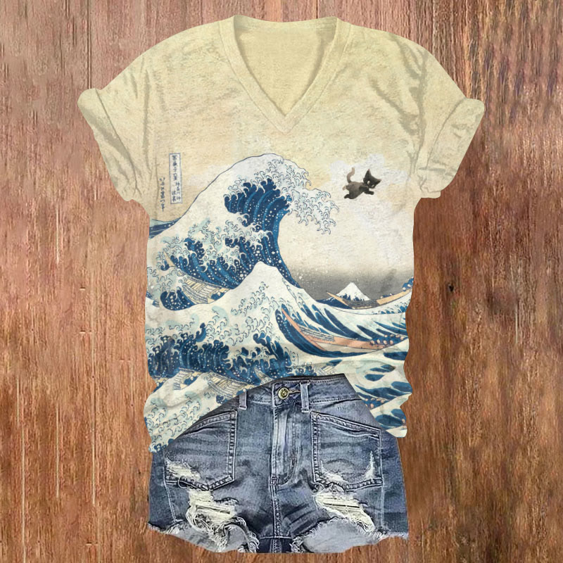 Dashingsoul Funny The Great Wave Off Kanagawa Black Cat Japanese Art Print V-neck Short-sleeved T-shirt