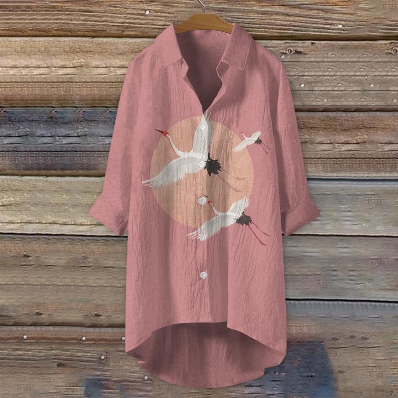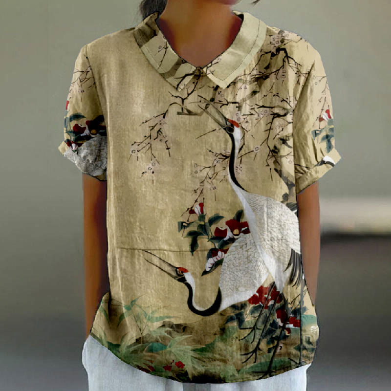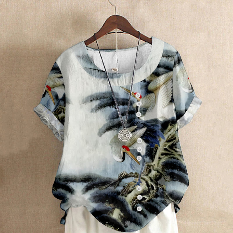 Dashingsoul Women's Japanese Style Oil Painting Crane Art Print Blouse