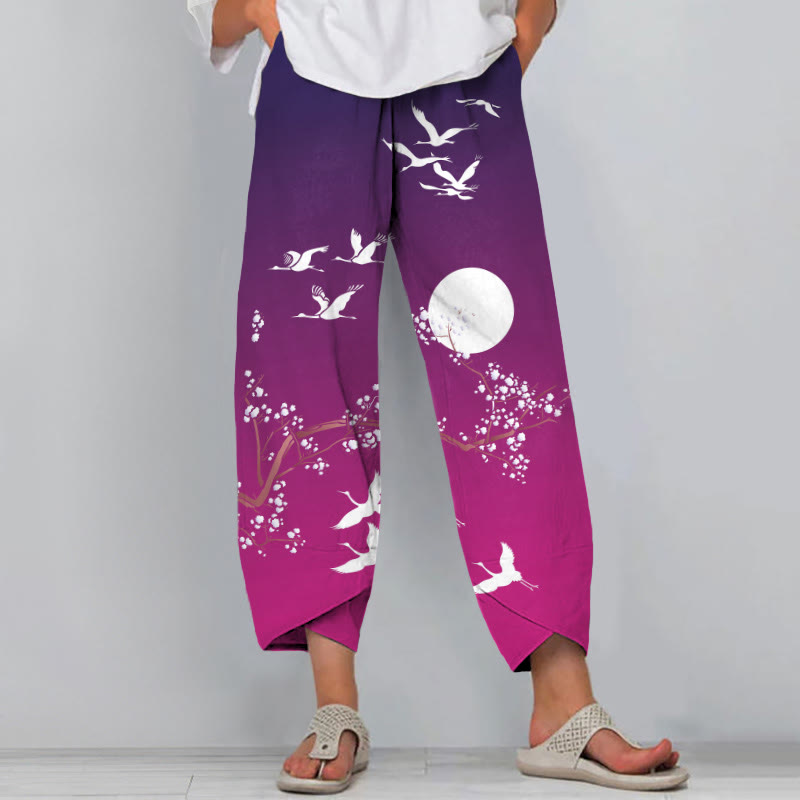 Women's Japanese Crane Art Ink And Wash Loose Pants