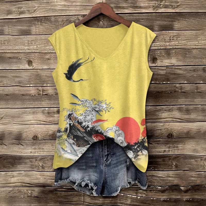 Dashingsoul Retro Wave Koi Crane Ukiyoe Art Print V-neck Tank Top