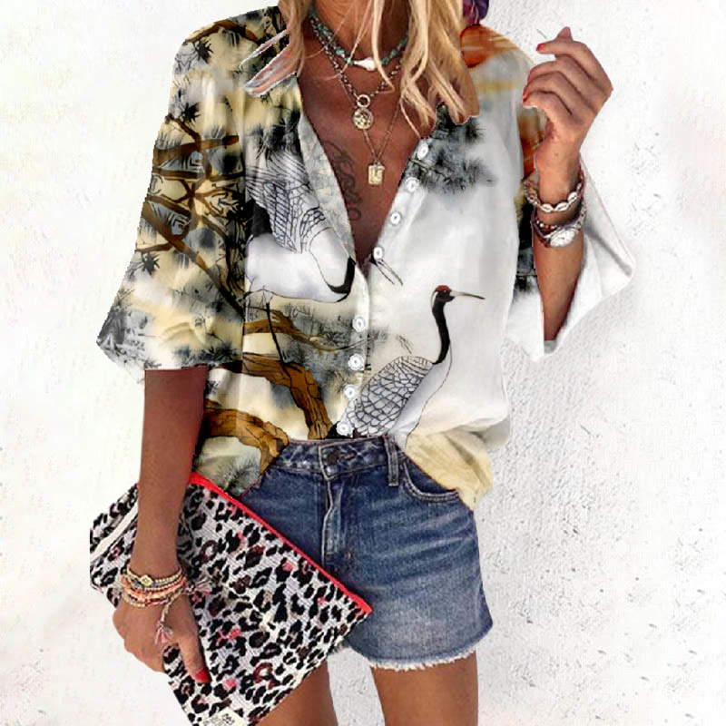 Dashingsoul Women's Oil Painting Chirping Crane Floral Print Casual Lapel Loose Blouse