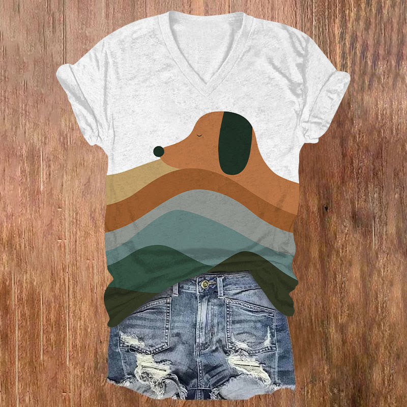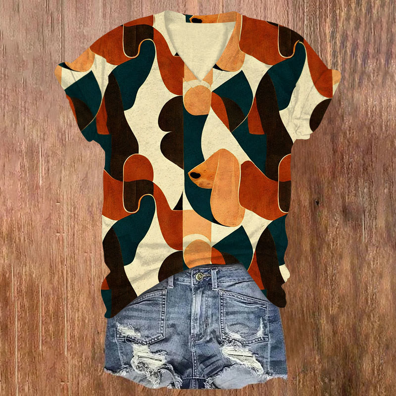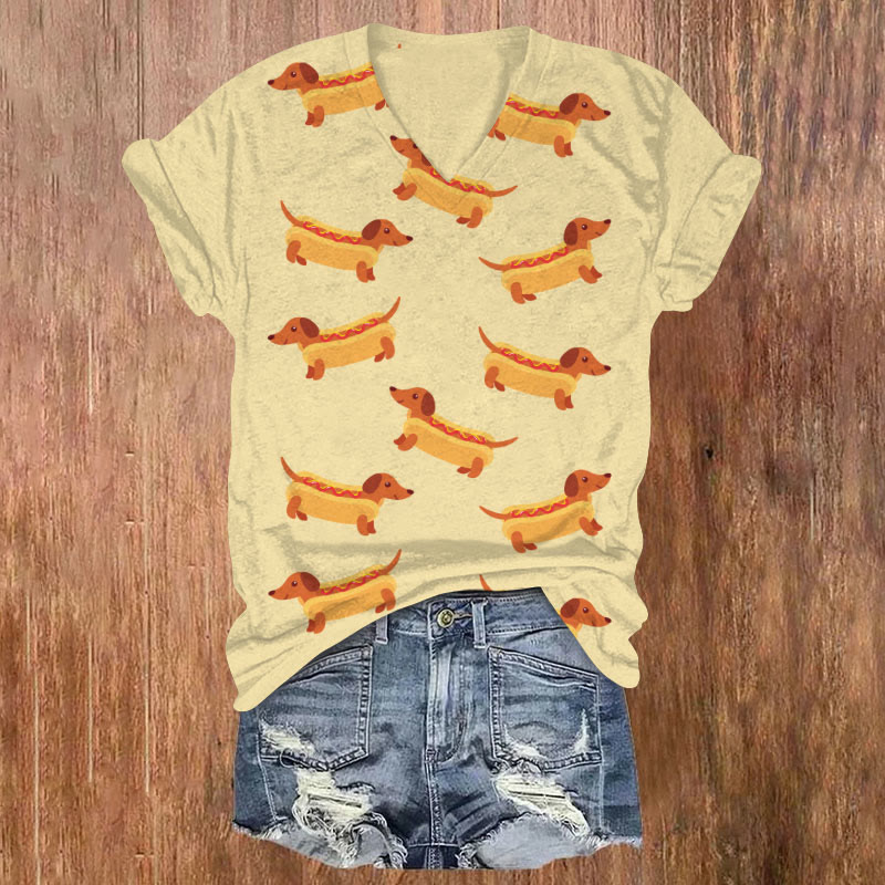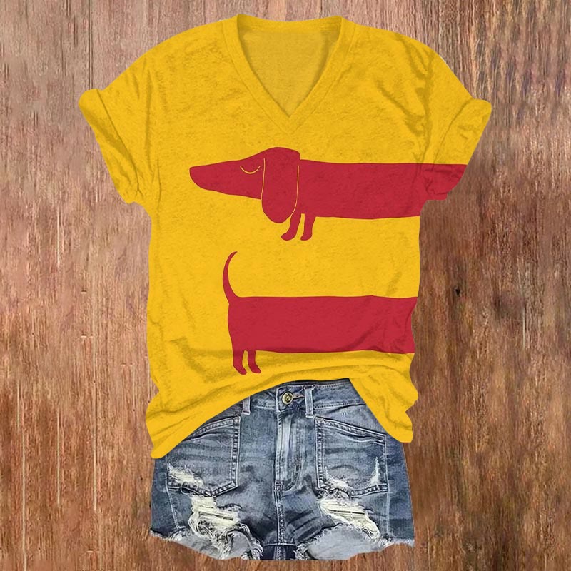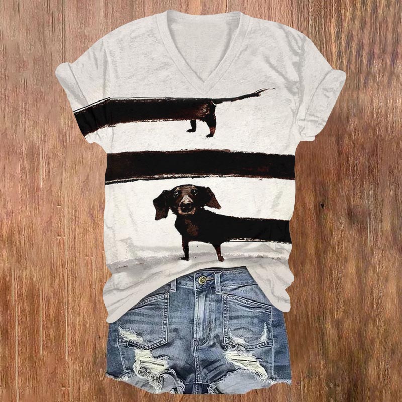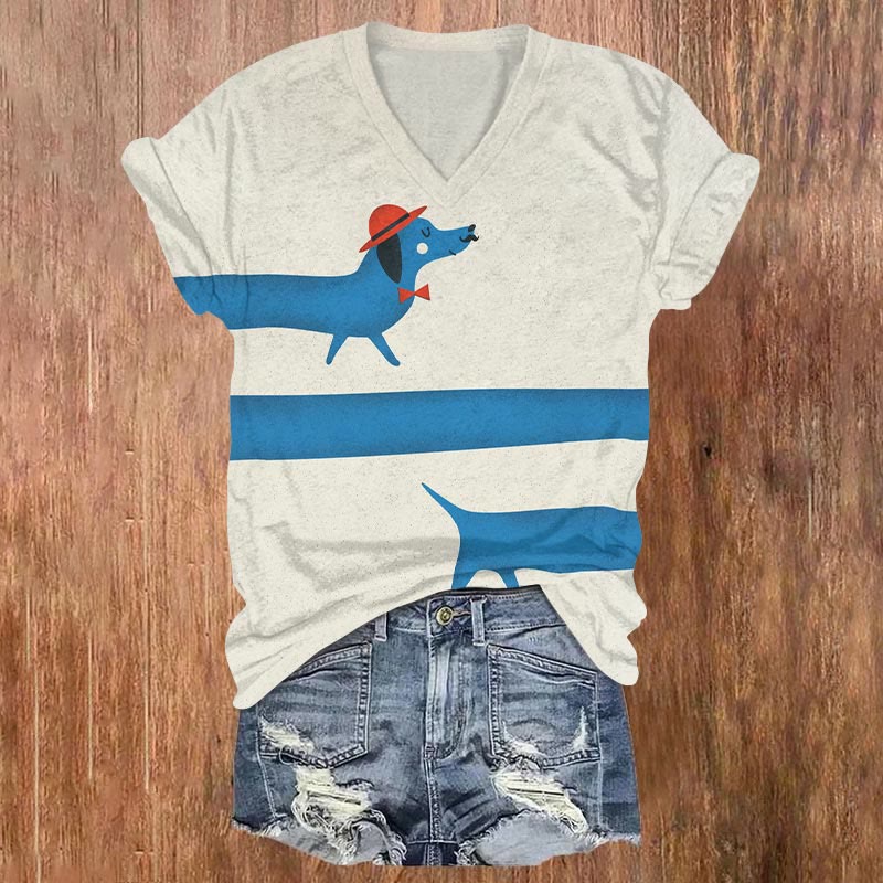 Dashingsoul Lively Dachshund Print Casual Women's Short Sleeve V-neck T-shirt
