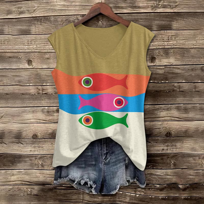 Dashingsoul Artistic Geometric Fish Print Women's Casual V-neck Tank Top