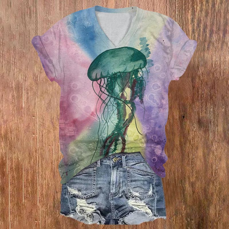 Women's Vivid Jellyfish Art Printed V-neck T-shirt