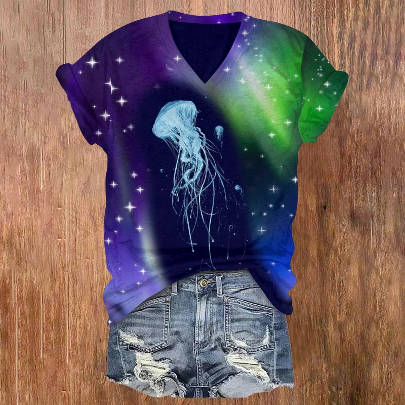 Dashingsoul Contrast Aurora Starry Sky Jellyfish Print V-neck T-shirt