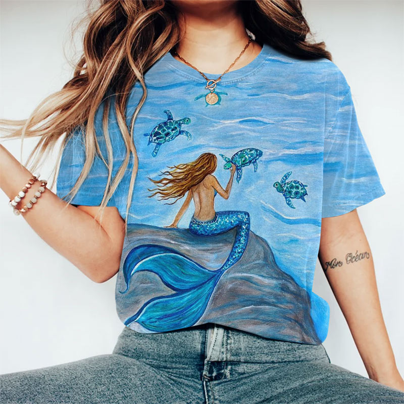 Dashingsoul Fantasy Mermaid Turtle Oil Painting Art Print Short-sleeved T-shirt