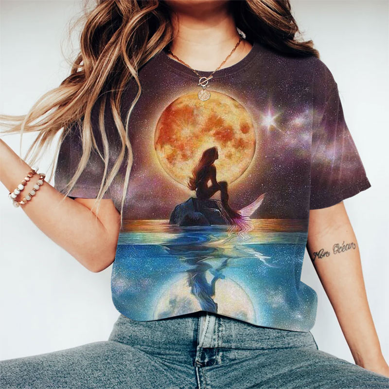 Dashingsoul Fantasy Moon Mermaid Print Short-sleeved T-shirt
